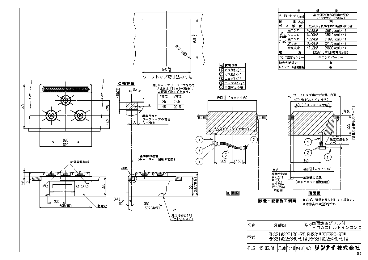 ※エコ連動機能はNECフォーマットのみ対応 仕様 メーカー リンナイ 型番 RHS31W22E4RC-STW[52-4240] トッププレート/カラー アローズホワイトガラストップ/ステンレス前面パネル 外形寸法 [mm] 269×596×539(トッププレート部9×592×509) 質量 [kg] 26 電源 単一形アルカリ乾電池×2(DC3V) ガス消費量 [13A:Kw(kcal/h)] [LPガス:Kw(kg/h)] [13A]全点火時11.2(9630)、強火力バーナー4.20(3610)、小バーナー1.27(1090)、グリル1.89(1630)、アフターバーナー部0.63(540) [LPG]全点火時11.1(0.793)、強火力バーナー4.20(0.301)、小バーナー1.27(0.091)、グリル1.94(0.139)、アフターバーナー部0.66(0.047) この商品について この商品の設置には取り付け工事が必要です 付属品:グリルプレート、ココット、活用レシピ、かんたんガイド、使いこなしブック、下火カバー、後部カバー、単1形アルカリ乾電池(2個)、取扱説明書(保証書付 一色刷)、設置説明書 ステンレスごとくは焼き色がつきますので予めご了承ください。